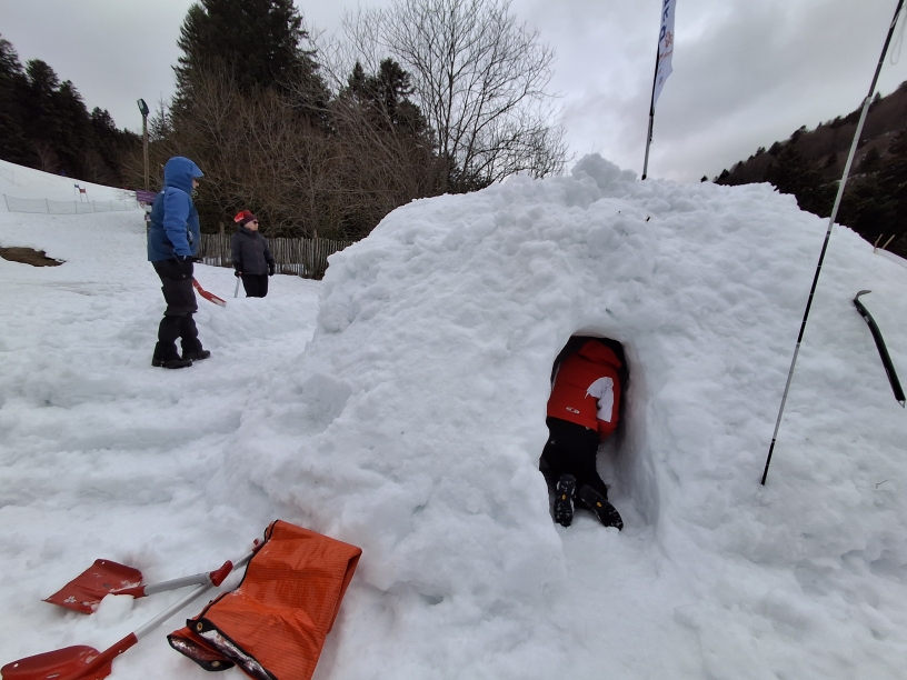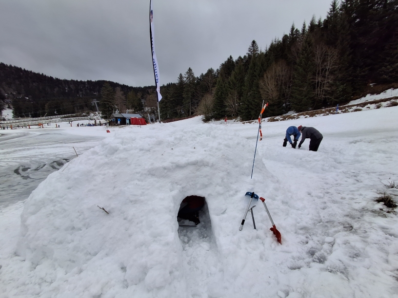 Un abri de type « quinzee » a également été réalisé en creusant un tas de neige mis à disposition préalablement par la station du Lioran dans la Prairie des Sagnes. Ce type d’abri est plus rapide à réaliser qu’un véritable igloo construit avec un assemblage de blocs découpés dans la neige. Il est aménagé avec une fosse à froid où l’air froid stagne par gravité, et avec des banquettes plus hautes sur lesquelles on peut s’assoir ou dormir. Un trou d’aération est réalisé au sommet afin que des bougies puissent réchauffer l’ambiance sans risque d’asphyxie, et enfin une sonde équipée d’un balisage signale l’abri à l’extérieur. A l’abri du vent et avec une température intérieure stable autour de 0°, cela peut permettre de survivre à une nuit glaciale en plein hiver.
